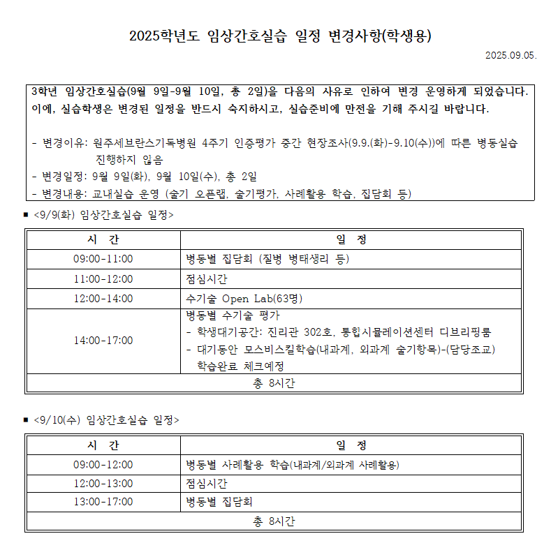2025학년도 임상간호실습 일정변경을 공지드리오니 일정 확인 및 첨부파일 확인하시어 세부내용을 참고하시기 바랍니다.