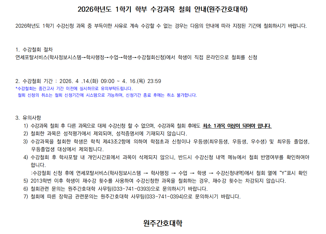 [전학년] 2026-1학기 수강철회 안내