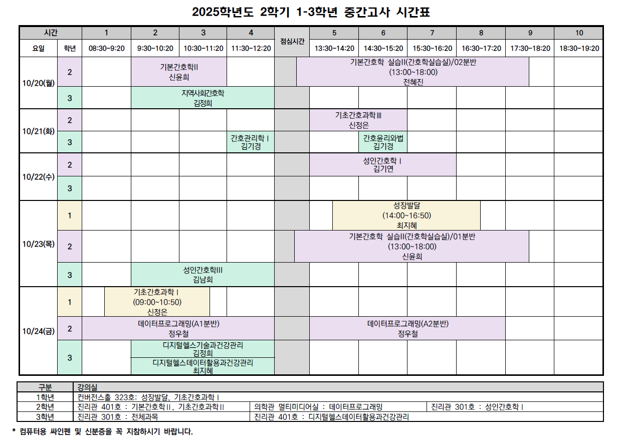 1. 시험(중간고사, 기말고사, 등) 시 학생증 및 신분증 지참하여주시기 바랍니다. (부정행위 및 대리시험 방지)