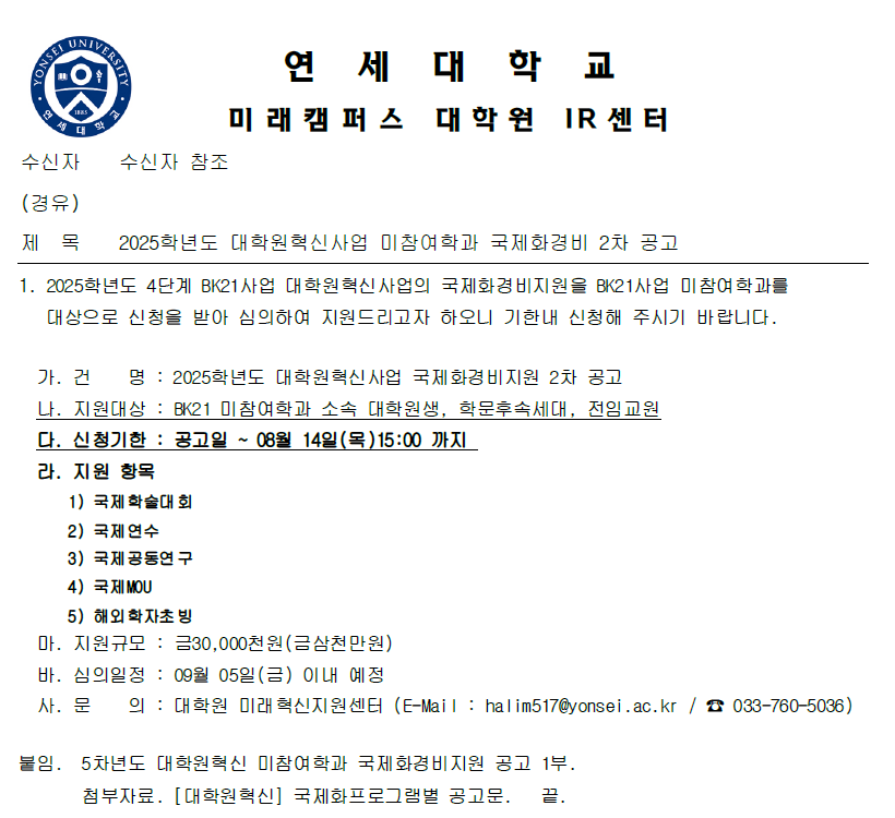 2025학년도 대학원혁신사업 미참여학과 국제화경비 2차 공고 안내