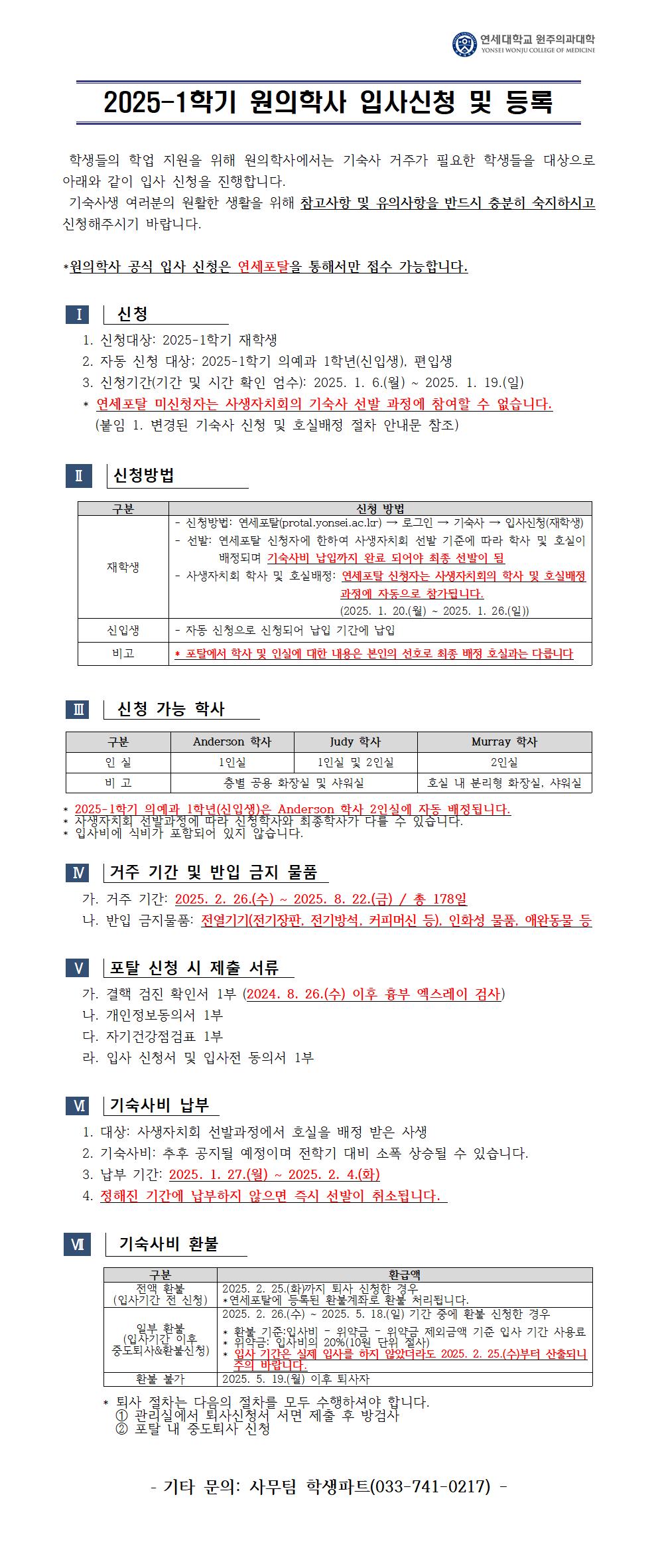 2025-1학기 원의학사 입사신청 및 등록 안내