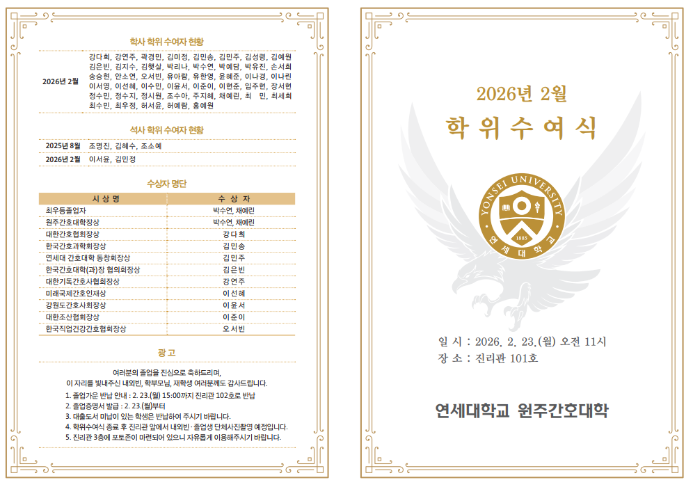 2026년 2월 원주간호대학 학위수여식을 아래와 같이 안내드리오니 확인바랍니다.