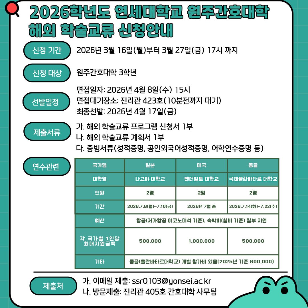 [3학년] 2026학년도 원주간호대학 해외 학술교류 신청 안내 (~3/27) -일정 수정